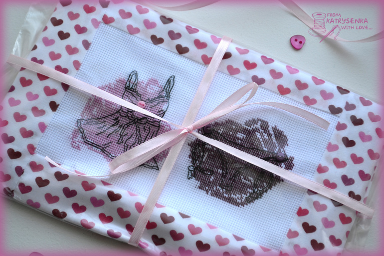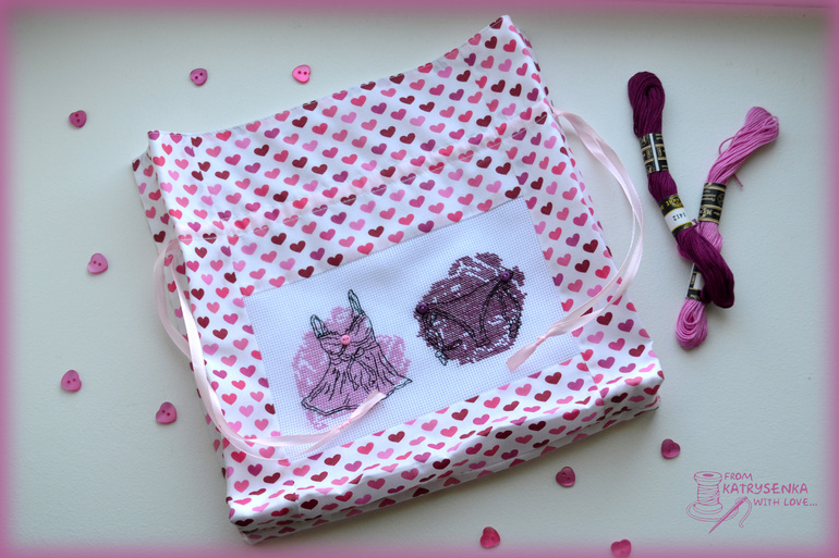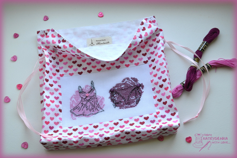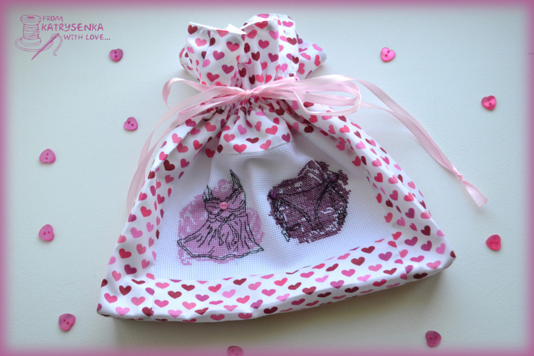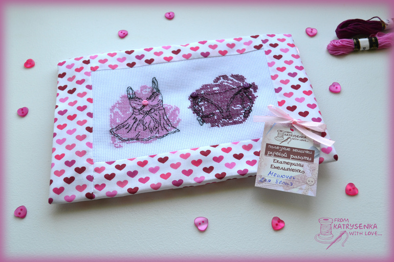 Мешочек сшит из американского хлопка - верх и украинского хлопка -подкладка, украшен вышивкой крестом с мотивом комбинации и трусиков (автор схемы Дарья Ушакова), вышивка дополнена пуговками.