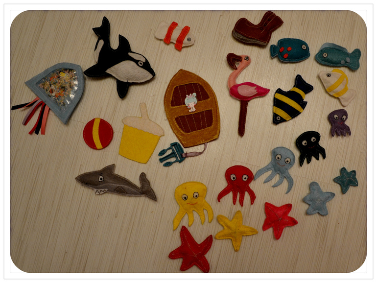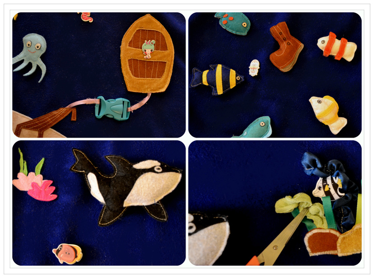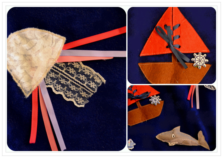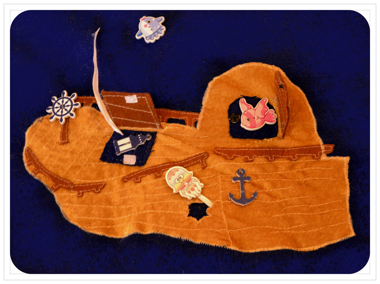 1. С пирса можно на лодочке отправиться на морскую прогулку. В лодочке сидит девочка (пуговка). Лодка крепится к пирсу на фастекс, а к морю на магнитную кнопку.