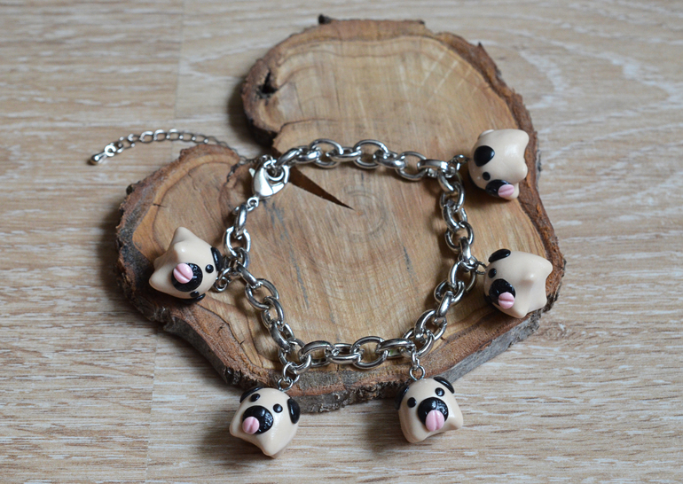 1. Браслет с подвесками-мопсиками из полимерной глины. Длина цепочки 19 см + цепочка-удлинитель.