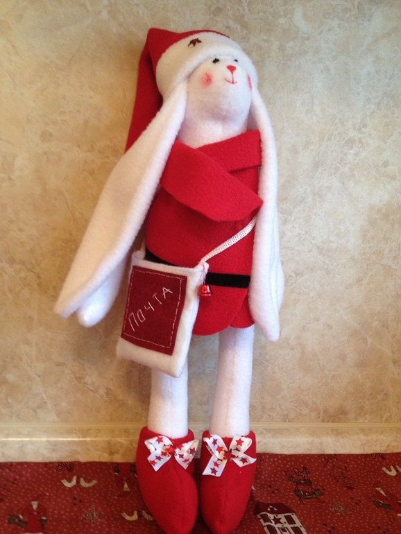 Игрушечный мир - животныеИгровой зайчик из флиса, вся одежда полностью снимается. Стоит у опоры. Приносит в своей сумке новогодние сюрпризы и задания. ( можно использовать как часть адвент календаря).