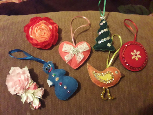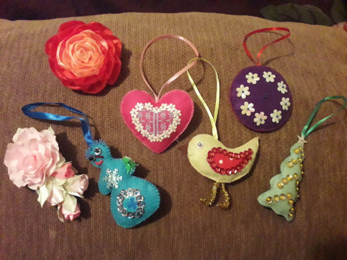 5 Елочных двусторонних игрушек из фетра, роза из атласных лент на резинке, букет из атласных лент на длинном зажиме.