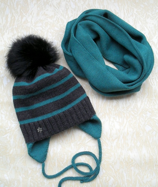 Комплект на мальчика: двойная вязаная шапка+флис между вязаных слоев. И двойной снуд в два оборота. Помпон съемный.