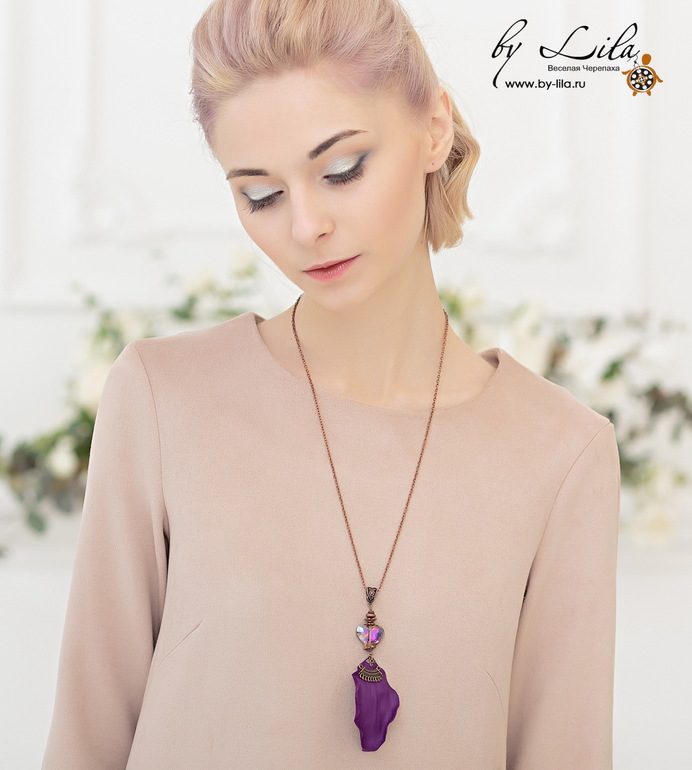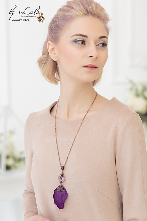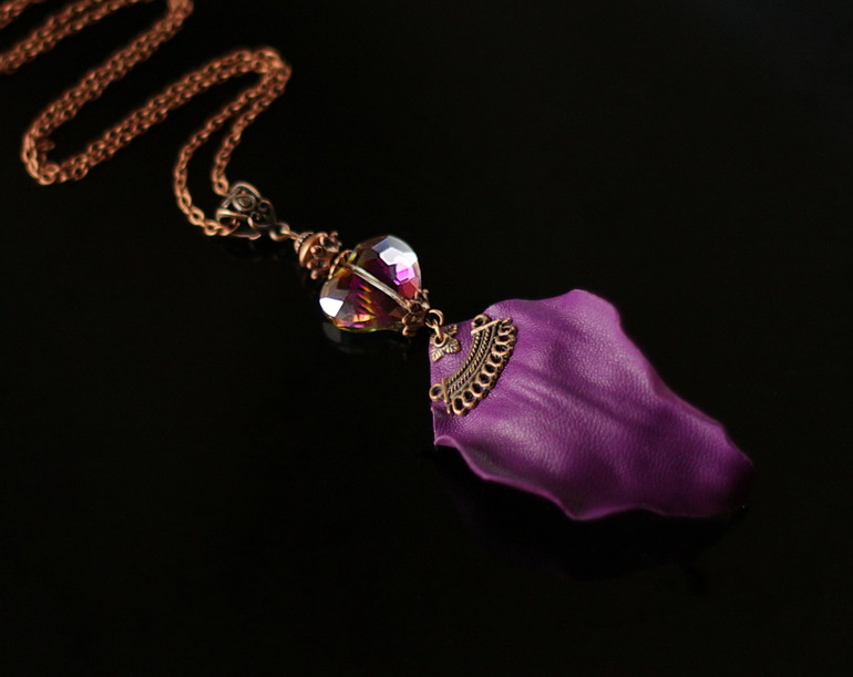 Кулон с лепестком из кожи красивого оттенка фиолетового и сияющим кристаллом.
