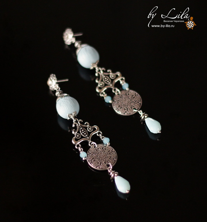 Бусина обтянута кожей цвета "зимнее небо", матовые бусины в тон. Швензы с искрящимися стразами, фурнитура цвета серебра.