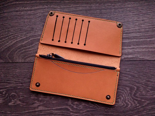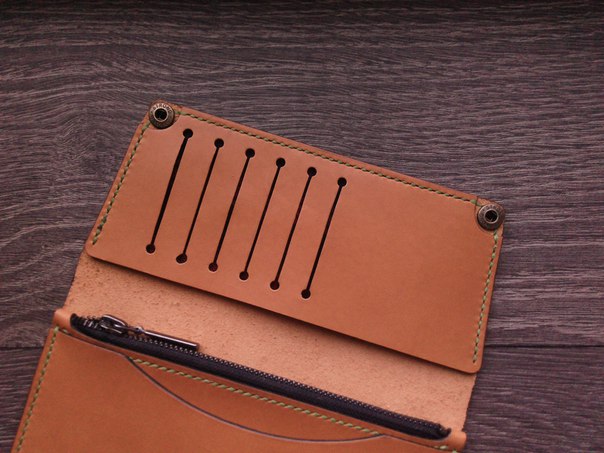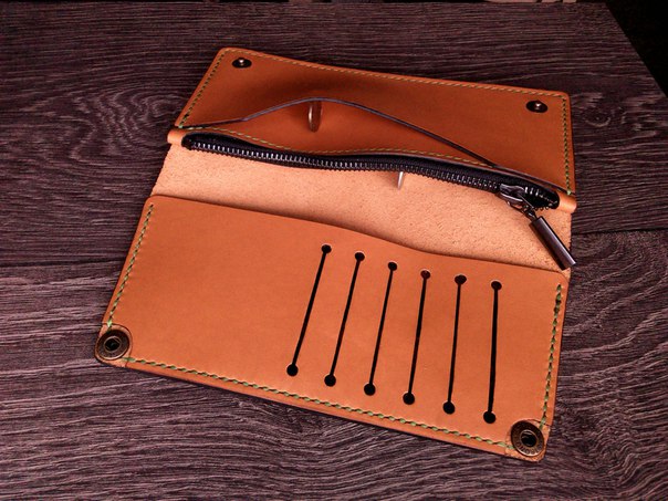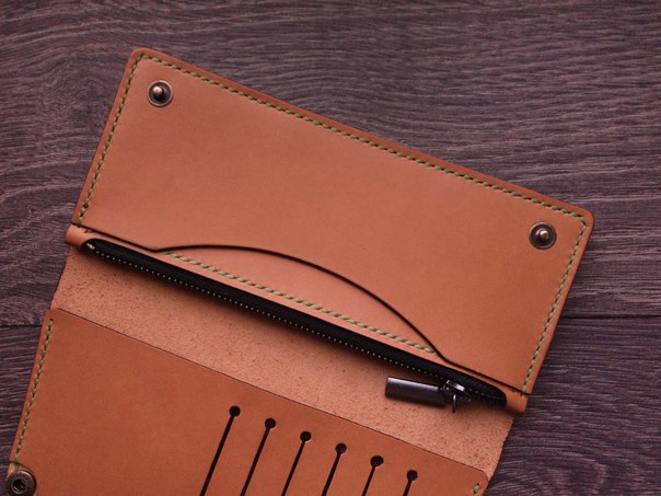 Никаких машинок, только кованая игла и нить натуральная. Ручная работа. Кожа трех видов. Кошелек имеет два больших отделения для купюр, одно большое отделение на молнии и 6 кармашков для пластиковых карт. В общем, что и нужно каждой женщине - очень вместительный.