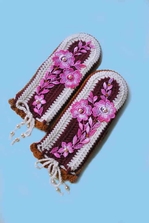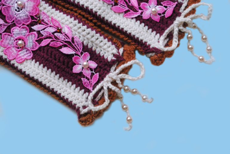 Связала ещё варежки, прямо драйв от процесса. Цветовую гамму взяла с коробки конфет Гейша, потому и назвала их так. Украшением стали бусинки и аппликации с вышитыми цветами.