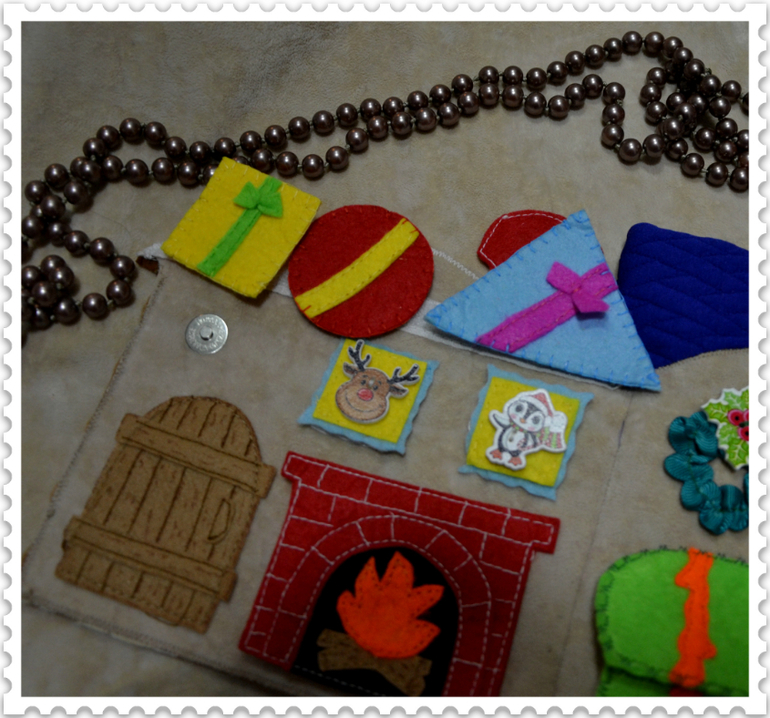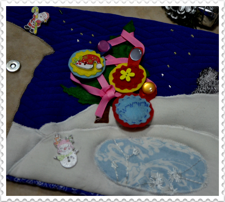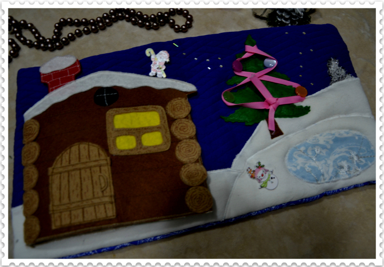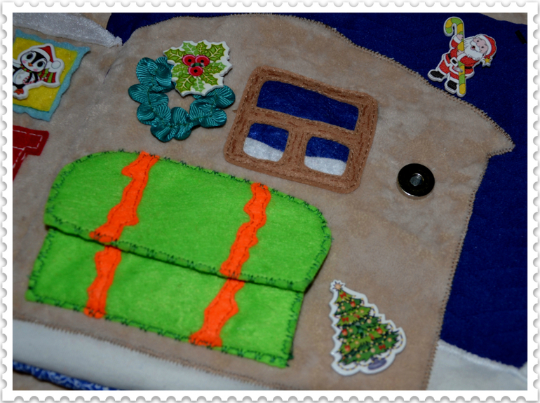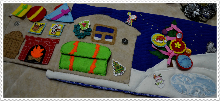 Домик Санты, елка, озеро, сугробы и снеговик. Домик застегивается на магнитную кнопку, сугробы мягкие, елку можно наряжать (вешать гирлянду и надевать шарики). Снеговик - пуговка, трогаем пальчиками. Замерзшее озеро шуршит. На крыше домика Санта.