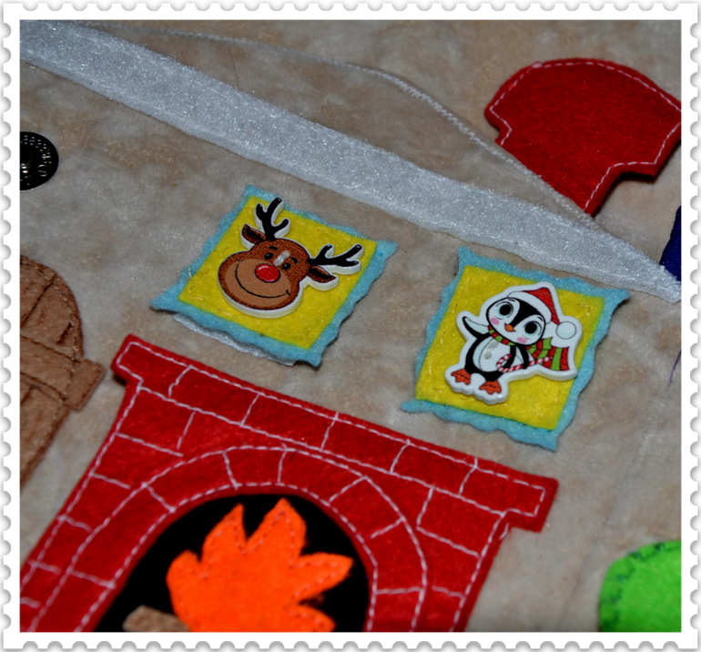Камин открывается, за ним пуговка варежка. Портреты оленя и пингвина тоже открываются. За портретом пингвина пуговка - звезда. Домик открывается влево, камин - вправо, олень - вверх, пингвин - вниз. Учим эти понятия. На крыше домика пуговка - Санта--Клаус.