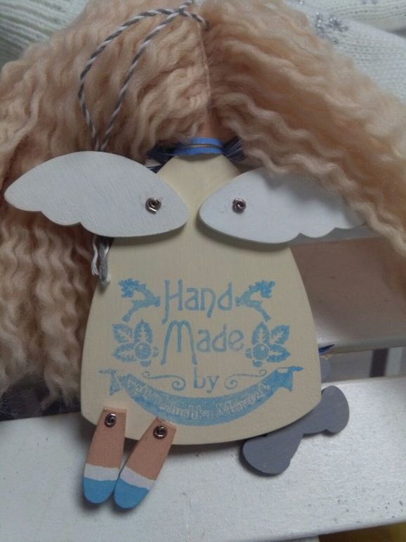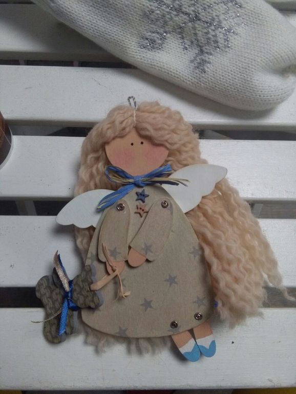 Она и подвеска для декора и игрушка, крылья колышатся, ручки и ножки подвижны, прическу меняет по настроению. Надеюсь, долго будет радовать свою хозяйку:). Фанера, шерстяная пряжа, текстильные ленты, пуговки, акрил и фантазия.