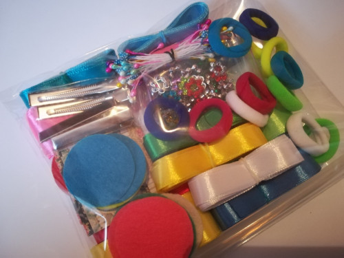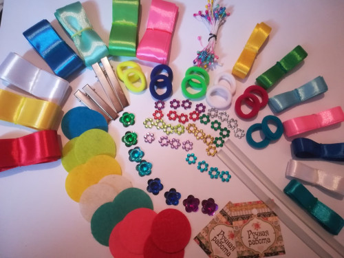 Слоник "Царство красоты" : Набор для создания украшений для волос. Слон состоит из : Двух видов атласной ленты 2.5 см. и 1.2 см. каждой по 2 метра. Фетровые заготовки кружки 14 шт. Резинки маленькие разноцветные 12 шт. Зажимы - крокодилы 4 шт. (размер 4.5 см. и 5.5 см. ) Серединки стразы кружки разноцветные 32 шт. и стразы цветы 8 шт. Разноцветные тычинки. Два стержня клея и две бирочки "ручная работа"