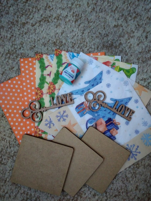 Слоник "Декупажная сказка" : 6 салфеток, 3 подставки под чашку - заготовки под декупаж, 2 декора love, акриловая краска - бирюзовая + сладости!!!