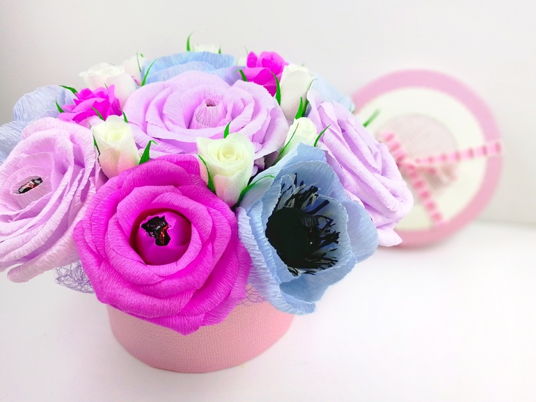 Нежный букетик роз и анемонов из гофрированной бумаги с конфетами.