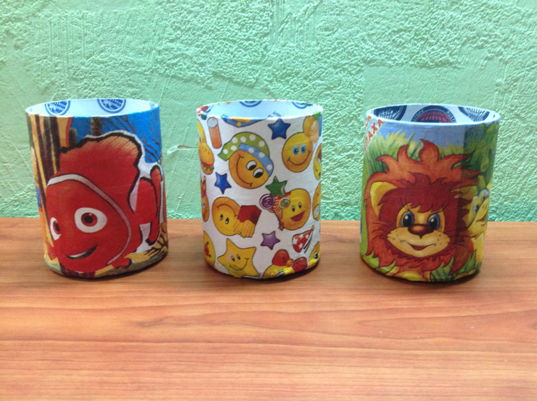 Склеиваю клеем пва 2 шт, дно - кружочек картона, обклеиваю белой бумагой(ее мне тоже 1 девочка с почты собирает - остатки от уведомлений :)) , и сверху салфеточку по типу декупажа. Вот фото где стаканчики азбука, монстры и винкс их еще лаком покрыла... Получилось хорошо но утомительно :) остальные не покрывала.