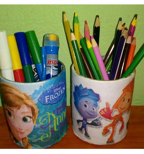 Мы с сыном делали подставку из пластиковой коробочки от ватных палочек. Украшали кусочками цветного скотча. Учились пользоваться ножницами) Получилось, как витражи, тоже красиво)