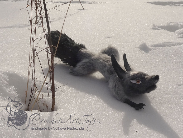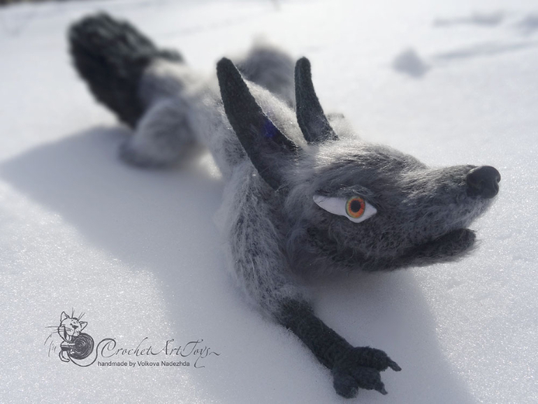Амигуруми (вязаные игрушки)По мк Ксении Ремневой связалась чернобурая лиса. длинна без хвоста 28 см. с хвостом 55 см. Пряжа Нако парис, Лебяжий пух и велюр бобинный, крючок 1,5 и 1.25. На проволочном каркасе. поза статична, глаза-полимерная глина.
