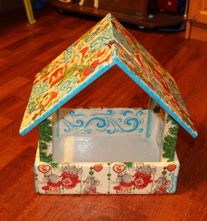 Кормушка - первая моя проба в декупаже. Муж сделал кормушку из досочек, она большая, примерно 27*40*35 см. Опять же грунт, наклеила фрагменты салфеток, дорисовала и.. 3 слоя алкидного лака.