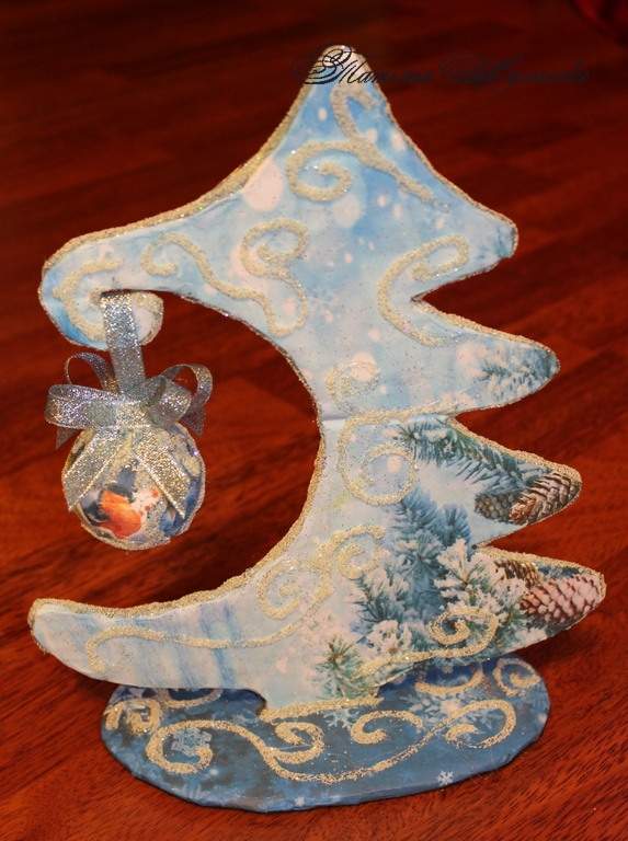 Ну и шар. Папье-маше на воздушном шаре, украшено фрагментами салфеток и покрыто двумя слоями акрилового лака. Тоже практически все делали дети сами, мне достался лак и бант.