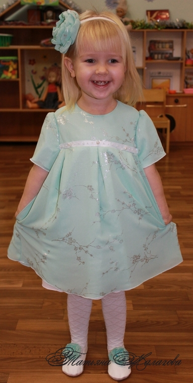 Шитье одежды, выкройки, ремонт одежды, шторы, швейные машины (уже приобретенные)Покажу еще Сонин новогодний костюм. Сшила из мятного шифона с серебряным рисунком сакура. Подкладка самая простая белая бязь. На чешки тоже прилепила цветочки как на повязочке, только маленькие. Цвет на первом фото немного искажен, реальный цвет ниже на фото повязки.
