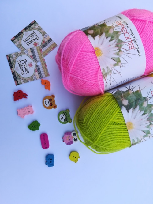 Слоник "Сочные краски": Два моточка пряжи по 50 грамм состав акрил .Цвета ярче немного чем на фото.И пуговки деревянные 10 шт.и бирочки две ручная работа.
