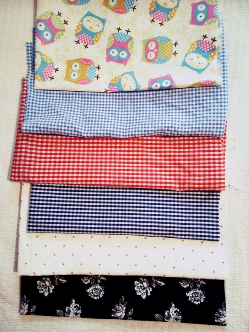 Слоник "Швейные багатства": 6 отрезов цветного хлопка : совы 30*40, голубая клетка 35*35, красная клетка 50*50, синяя клетка 60*35, звёздочки на белом 60*30, чёрная с розами 30*40