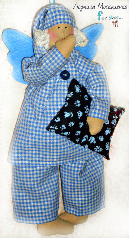 Слоник "Приятных снов": Интерьерная игрушка Сонный ангел ( Тильда Сплюшка ) . Рост 34 см . Тело сшито из бязи тонированной раствором чая . Одежда из цветного хлопка ( не снимается ) . Крылья из фетра . Под крылья пришита петелька для подвешивания . Кукла не стоит , может сидеть и висеть. Одна рука пришита к ротику , вторая к подушке и телу . Сплюшка украсит интерьер и по способствует тому , что ваши сны будут только радостными , а пробуждение приятным .