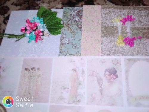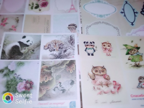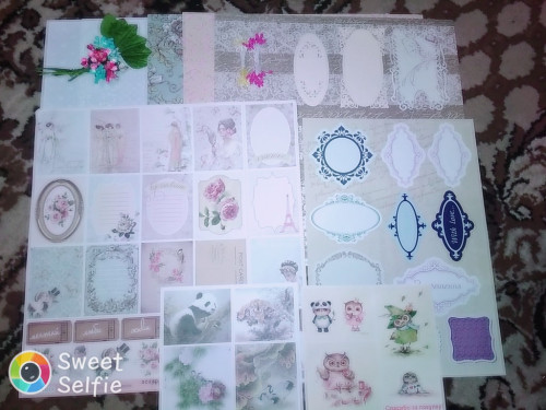 Слоник "Радость скрапового хомяка": 6 листов 30*30, 2 листа больших с картинками, 2 листа маленьких с картинками, 3 шт вырубки, листочки и тичинки.