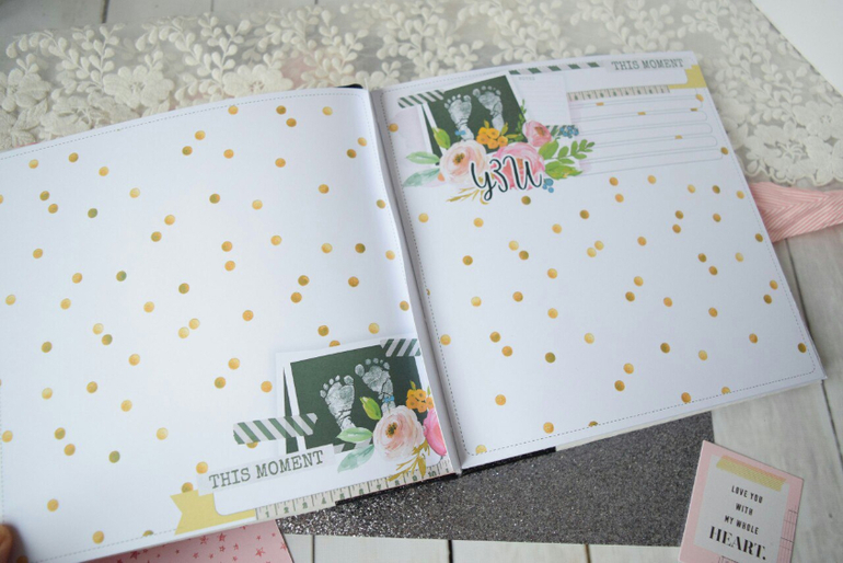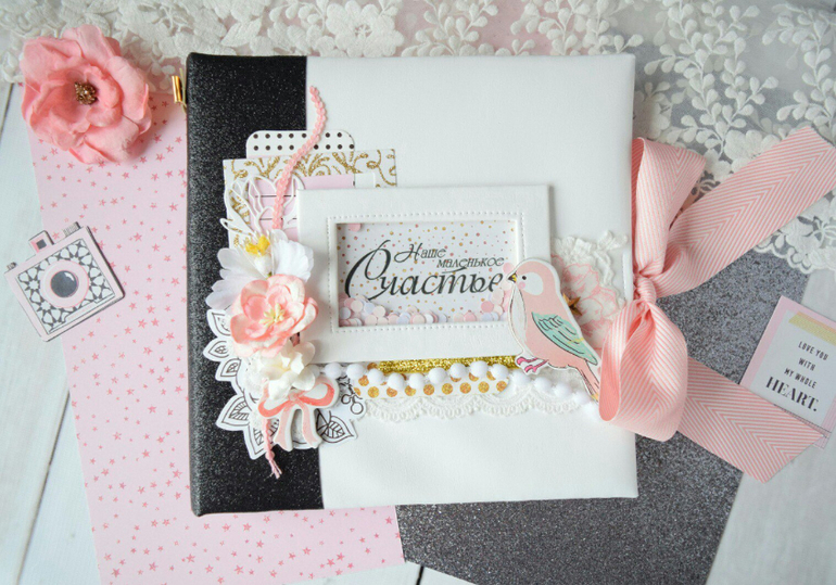 Быстренько покажу милейший девочковый альбом, выполненный с учетом всех современных веяний: тут и матовый гладкий кожзам, и черный глиттерный, который как нелзя лучше подчеркивает контраст страниц внутри. Шейкер, и множество интересных деталей. Ну а страницы- вы только посмотрите! Мамочке точно будет, что записать и перечитывать, когда дочка станет взрослой)