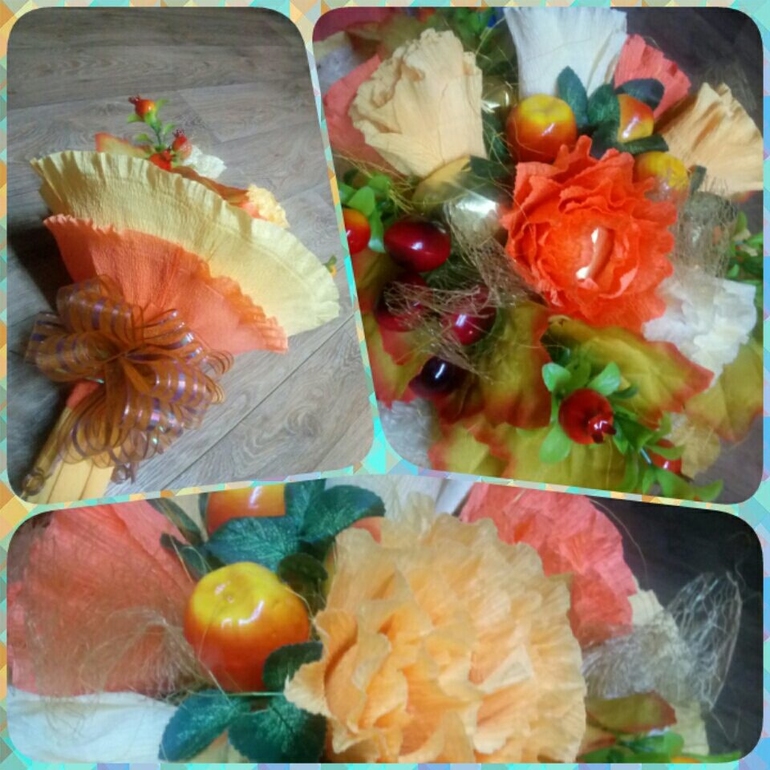 букет из зефира,пастилы и сладких трубочек плюс палочки корицы. Запах был просто волшебный. Каждый элемент завернут в пищевую плёнку,работала в перчатках одноразовых
