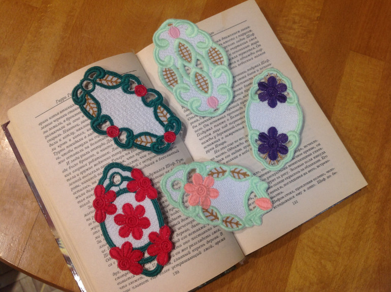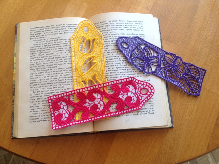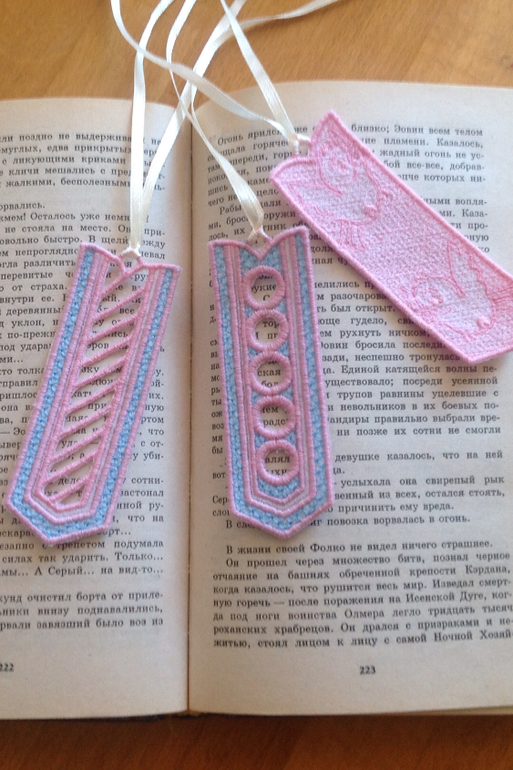 Вышивка картин. Крестиком, гладью, бисером, стразами, лентами, схемы по вышивкам, процессыНаткнулась на просторах Интернета на дизайны закладочка и не смогла пройти мимо - просто оторваться не могу. Пока тренируюсь на обычном флизелине, но и на нем неплохо получается, а когда перейду на водорастворимый и станет настоящее кружево получаться, вот тогда я буду в полном восторге. А ещё в планах закладки для школьников - на каждый предмет своя закладка - подарок к началу учебного года классный (у нескольких подружек детки в школу идут, вот и сделаю им приятный сюрпризик, а главно нужный). А как Вам такие штучки?