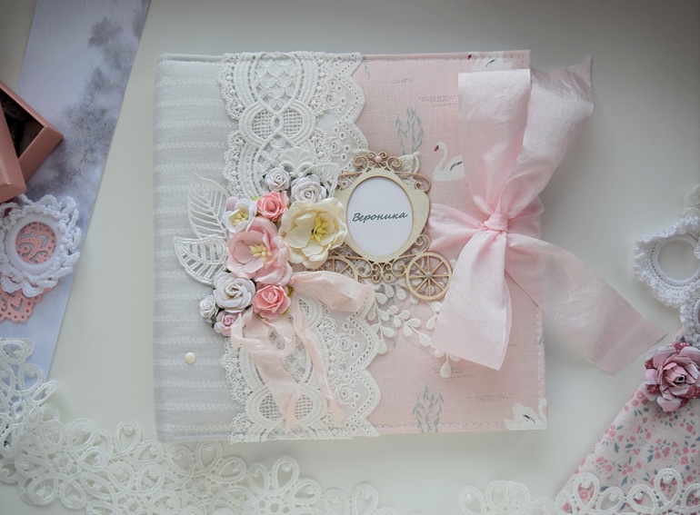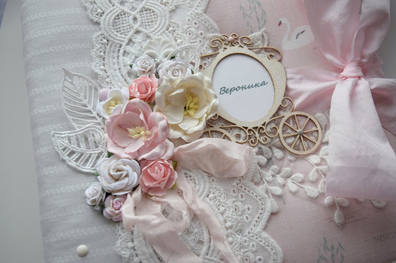 Итак, этот альбом заказали для свободного вклеивания фото- без привязки к датам и событиям. Тут как раз у меня был готов блок, заказчица согласилась, и альбомчик получился быстро. На обложке она хотела кружево и цветы, ну и от кареты не отказалась)