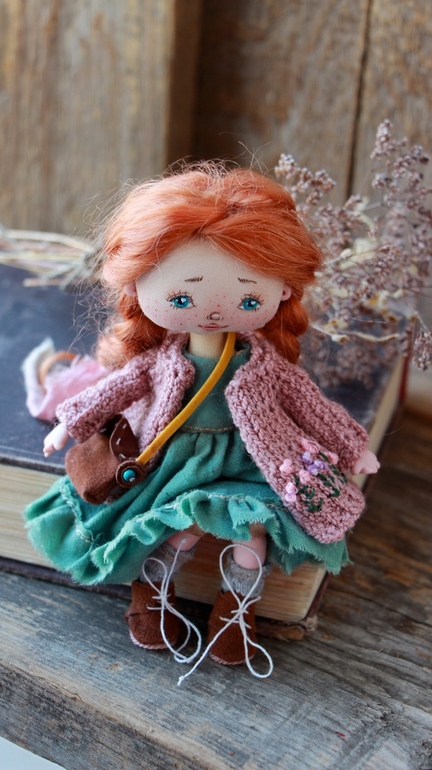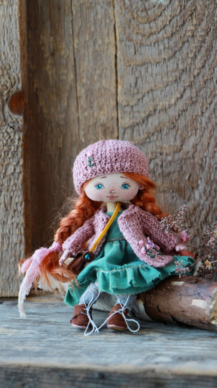 Кукольный мир - человекоподобные куклыДобрый день! у меня крошечная девочка с большим и добрым сердечком. Одета в хлопковое , платьице...в вязанные на спицах кофточку и шапочку. На ножках ботики ручной работы из натуральной кожи.Есть сумочка из замши. Одежка снимается. Волосы натуральные локоны козочки, проклеены и прошиты...можно расчесывать и делать прически. Личико расписано акрилом и маслом. Куколка подвижная, крепление пуговичное. Стоять не умеет, сидит красиво)). Чистое солнышко!!!!!Ростик 15см.