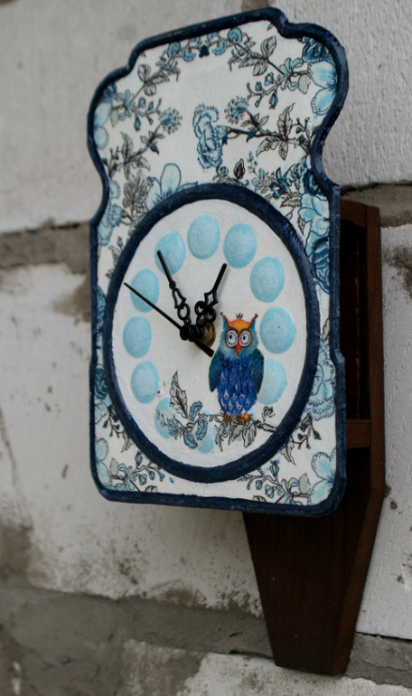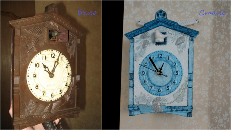 Часики-переделка. Уже давно мне муж привез от бабушки из деревни пару старых часов и ждали они своего часа несколько лет у меня. Все так же под новый голубой интерьер кухни, на замену предыдущих, тоже в форме домика (люблю домики в интерьере)