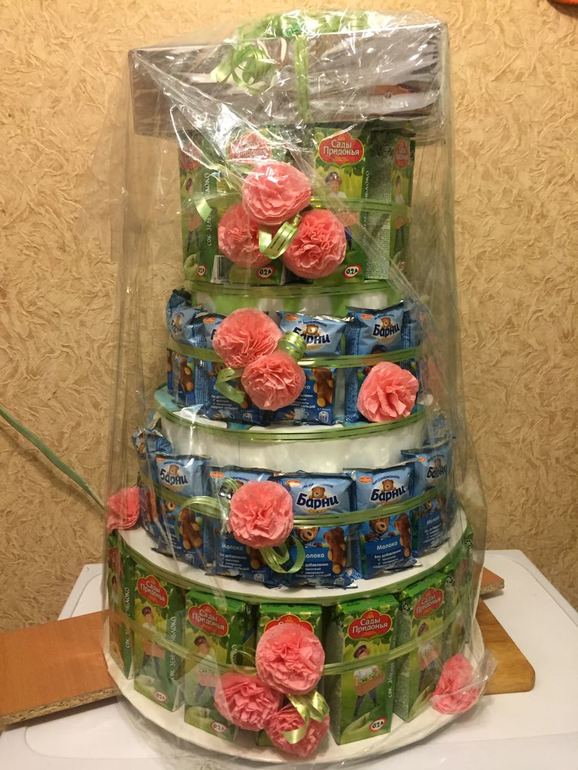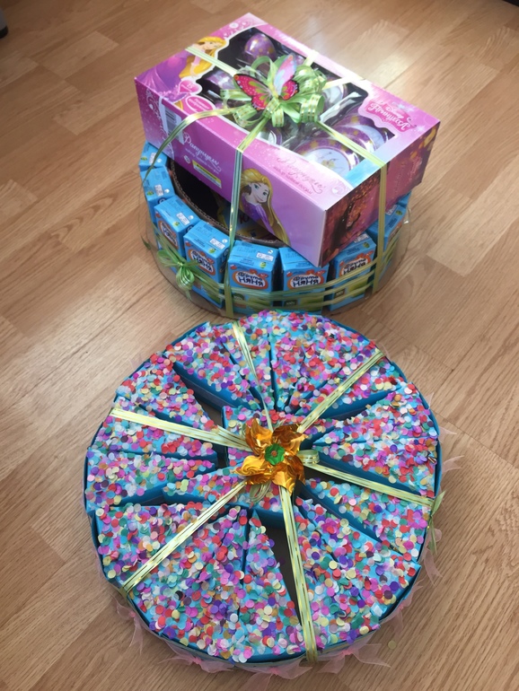 Подарки, игрушки, погремушки для новорожденных.Угощение на день рождения в детский сад. Шаблон кусочка торта скачала в интернете, распечатала его на картоне, склеила, внутрь положила угощения, немного украсила, все на картонку, и торт готов. Ощущение праздника было создано: