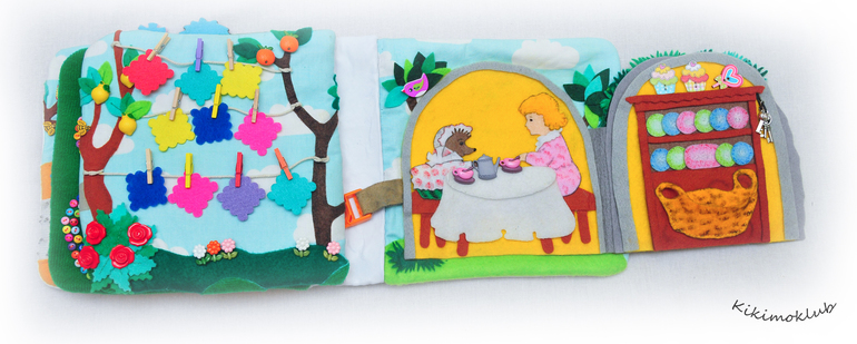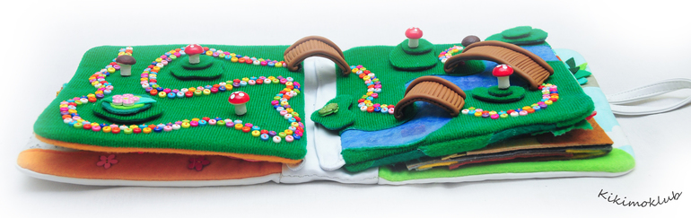 Сюжет по мотивам песенки "Ежик резиновый". Грибы, зеленые островки и мосты - на липучках, их можно прилеплять на страничке в произвольном порядке. Рыбки в речке плавают.