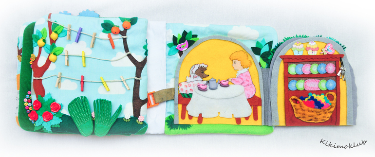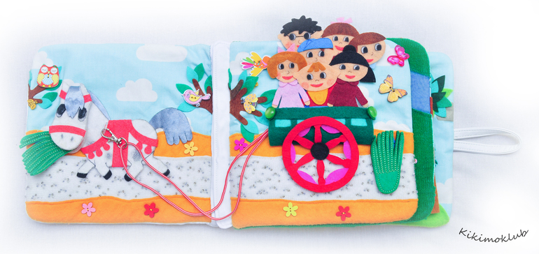 Сюжет на песенку "У пони длинная челка из нежного шелка". Лошадку можно накормить травой, отыскав её на другой страничке книжки. Также нужно найти вторую пчелу, пристегнуть колесо к телеге, а телегу к лошадке. Детей нужно посадить в тележку, отстегнув и пристегнув при этом створку тележки.