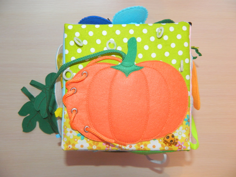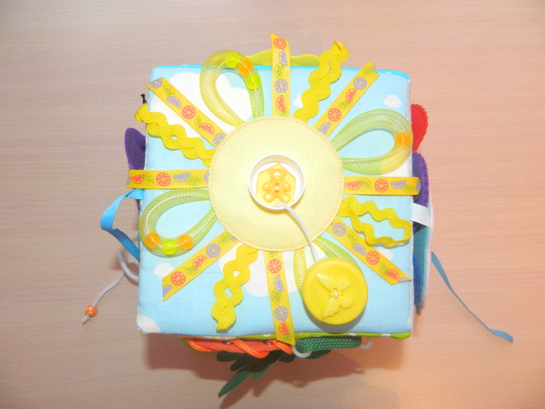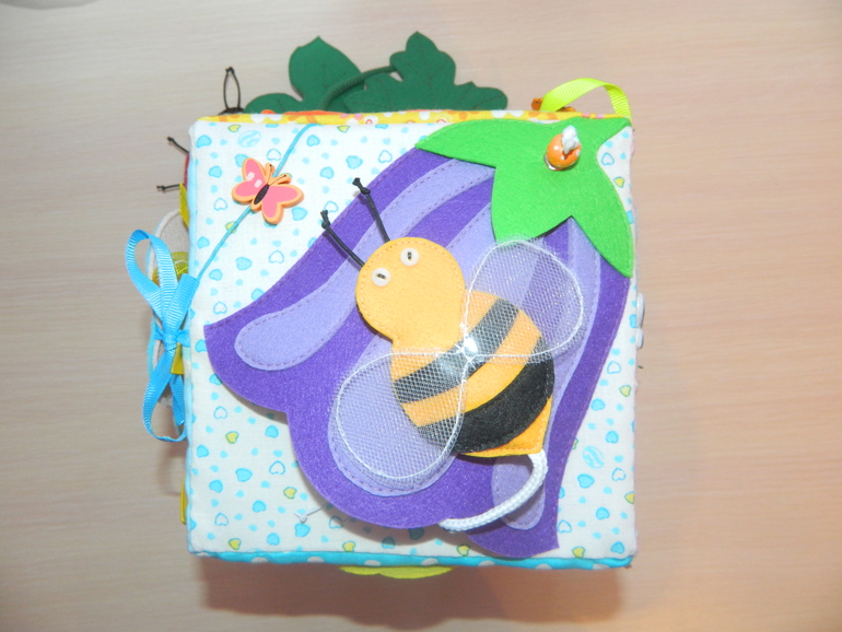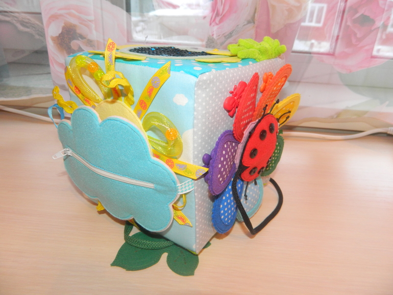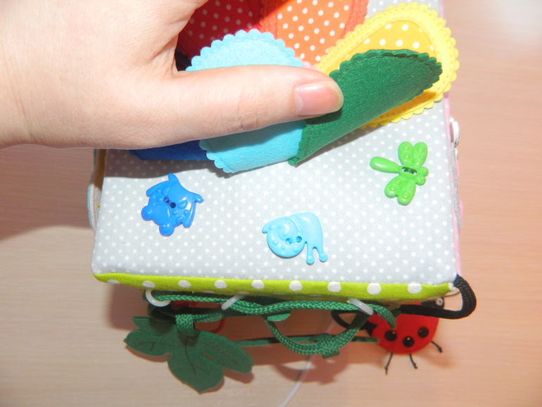 4 грань - Цветок (изучаем цвета радуги, лепестки шуршат, божья коровка на липучке, в нее вшита пищалка, за лепестками прячутся пуговицы в цвет);