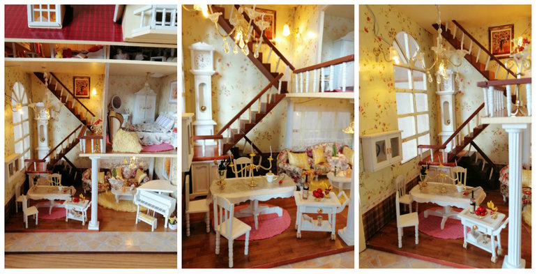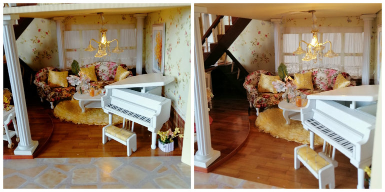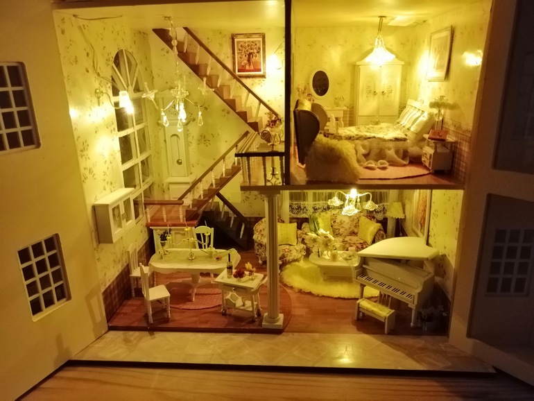 Это гостиная с роялем. Под лестницей встроила маленькую шарманку, так что можно заводить, и кажется, что кто-то на рояле играет.