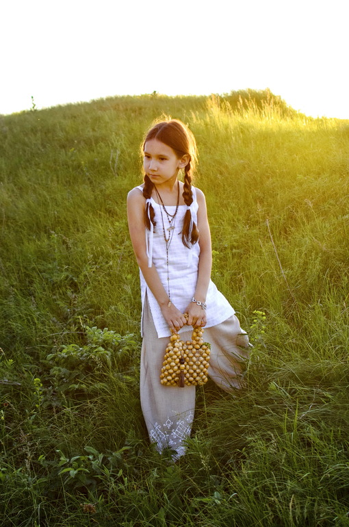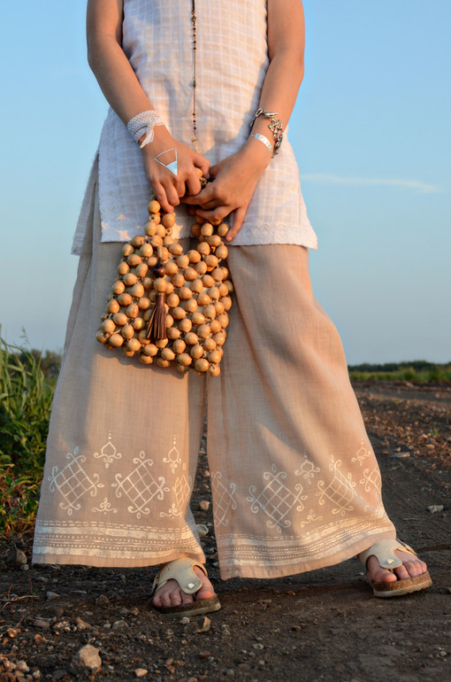 Силуэт создала с помощью тонкой хлопковой майки и штанов из муслина, раскрасив их башкирскими мотивами. Сумку из деревянных бусин сплели на пару с дочкой))