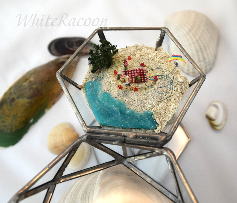 Песок с пляжа, где было сделано предложение, фотографии деталей и шкатулка для размещения миниатюры мне были предоставлены - и я начала работу.