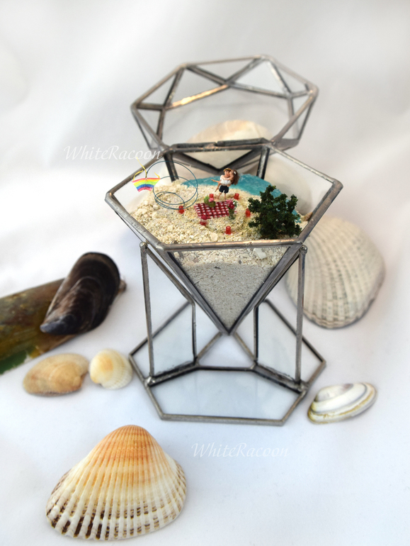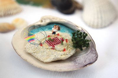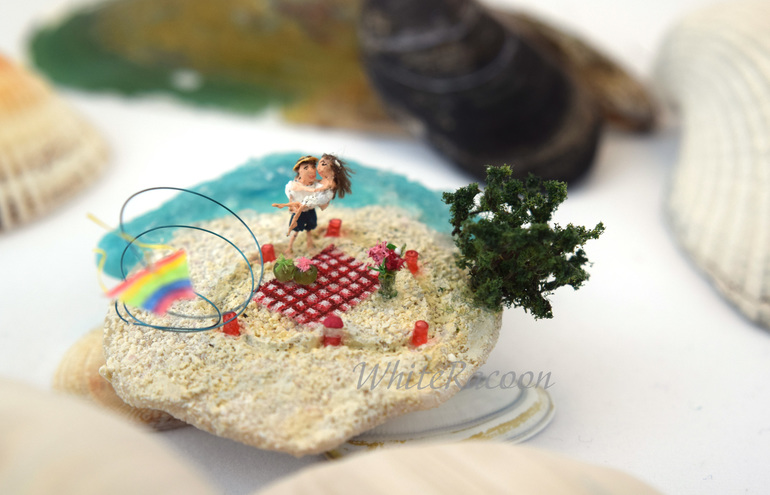 Ну а с миниатюрой даже проще было =) Только с песком немного озадачилась. Потому что песок мне выдали после "unity ceremony" - это когда в один прозрачный сосуд двое сыпят разноцветный песок и получается красивый узор в итоге. И получилась смесь натурального и розовенького. Розовый пляж как-то нелепо выглядит. Села я как Золушка перебирать песчинки. Розовенькую сюда, беленькую туда, розовенькую туда, беленькую сюда... Через 15 минут с кучками по 1 см я поняла, что так дело не пойдёт и начала хитрить. Просеяла песочек, отобрала самый крупный ракушечник и в ступке измельчила до нужных фракций. Уф! А то бы перебирала я его ещё месяц...