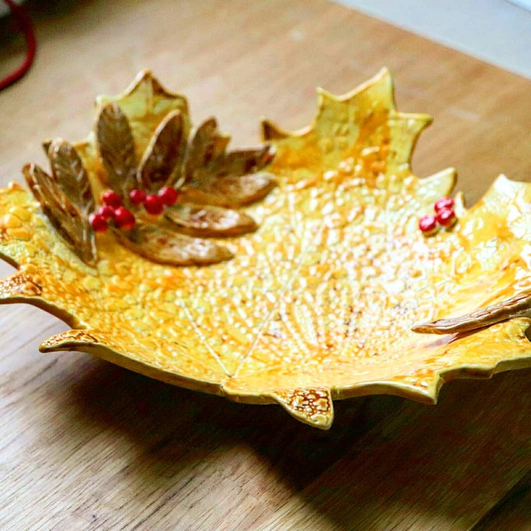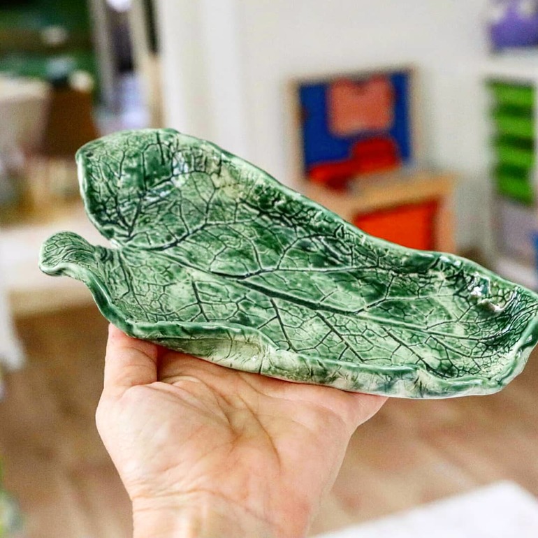 Если без обжига, то лучше взять самозатвержевающую глину jovi или подобную. Раскатываете пласт 5-6 мм толщиной, на него накладывает любой лист, прожилками вниз, чтобы отпечатать. Прокатываете скалкой, чтобы лист слегка вдавить в глину. При помощи иглы вырезание по контуру листа и снимаете его с пласта глины. Придаете форму и сушите. Потом при желании можно покрасить акрилом.