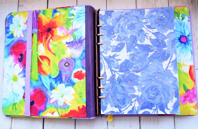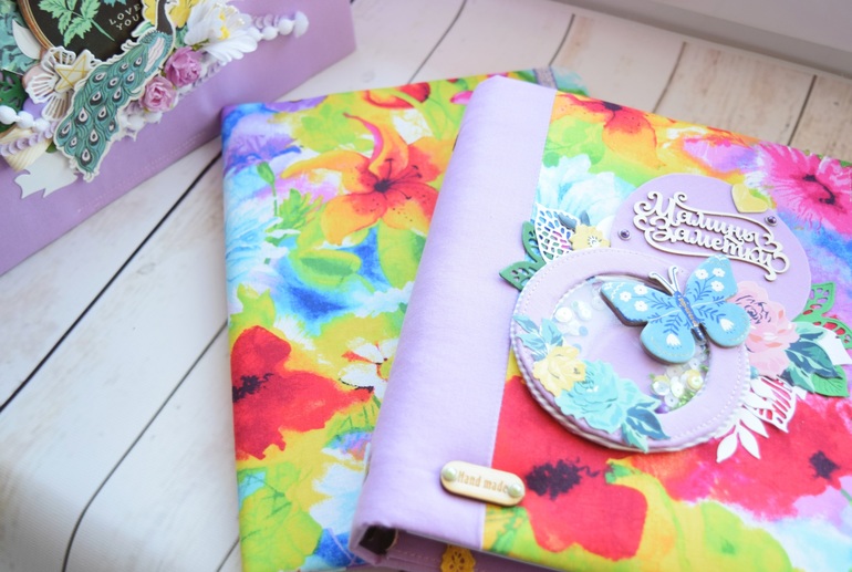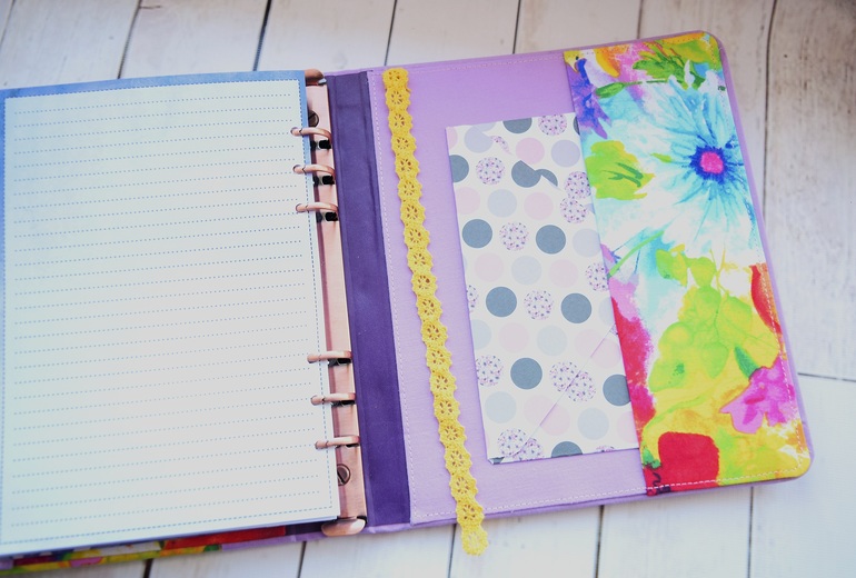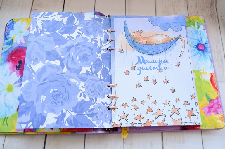 Внутри на кольцевом механизме. Форзац и нахзац тканевые, на них разместила кармашки для мелочей.