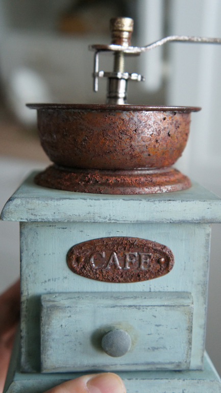 Мне нужно было украсить буфет в винтажном стиле.Имелась вот такая вот ручная кофемолка,но она совсем не вписывалась в мой стиль кухни.Перекрасила ее и состарила.Ржавчину сделал из подручных материалов-соли и красок.Она действующая,можно использовать по назначению.