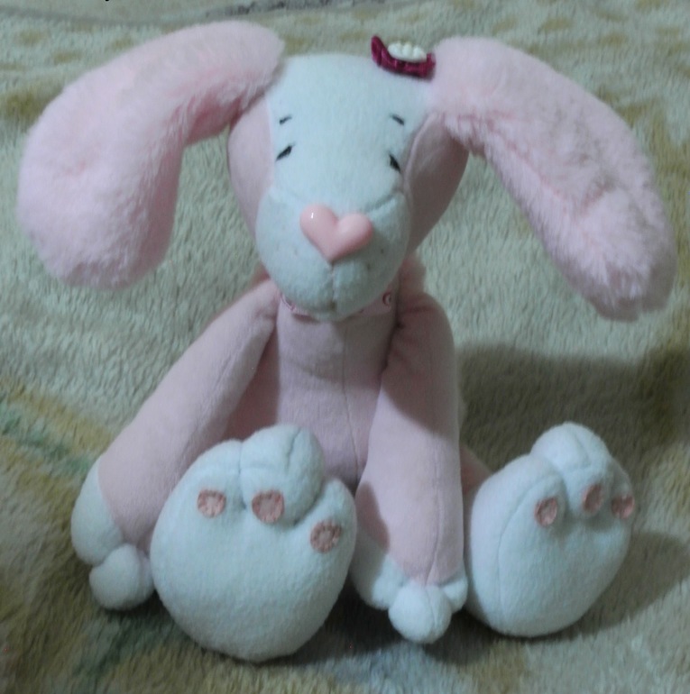 Я перебрала кучу выкроек, и в результате получилась обнимательная и мягкая девчонка, с мягкими лапками (в которых перекатывается гранулят), задорным хвостиком и огромными мохнатыми ушами! Похоже весьма условно, но главный заказчик, девочка Маша, результат одобрила. Цветочек на голове и расстёгивающийся (!) ошейник - часть девочкиного заказа - мол, так было у прежней. Надеюсь, они подружатся!