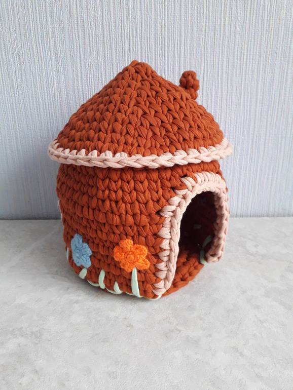 Именно с домом пришлось повозиться. Во-первых, потому что из трикотажных ниток я вязала всего лишь один раз, и то давно. Во-вторых, вязала без схемы, придумывая и переделывая на ходу. Но зато итог мне очень понравился. А отделка стен домика цветами и травой сделала его еще красивее!