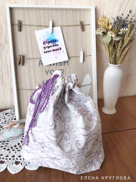 Сшита из хлопка. Двухслойная. Внутри кармашки. Затягивается на шнурок. Под кат много фото