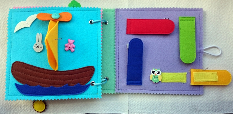 3.разворот. Кораблик.В парусах спрятаны пуговки -животные.На мачте крутится "вертолётик"