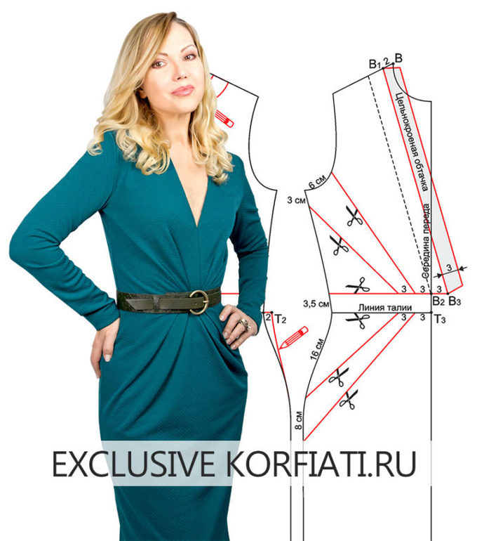 Фасон этого платья удивительным образом обыгрывает женские формы и подходит практически для любой фигуры. Основная ставка здесь сделана на насыщенный изумрудный цвет фактурного трикотажного полотна, а облегающий силуэт, подчеркнутый симметричными складками, и V-образный вырез превращают эту модель в настоящий шедевр. Талия дополнительно подчеркнута оригинальным ремнем. Выкройка облегающего платья - в этом уроке.