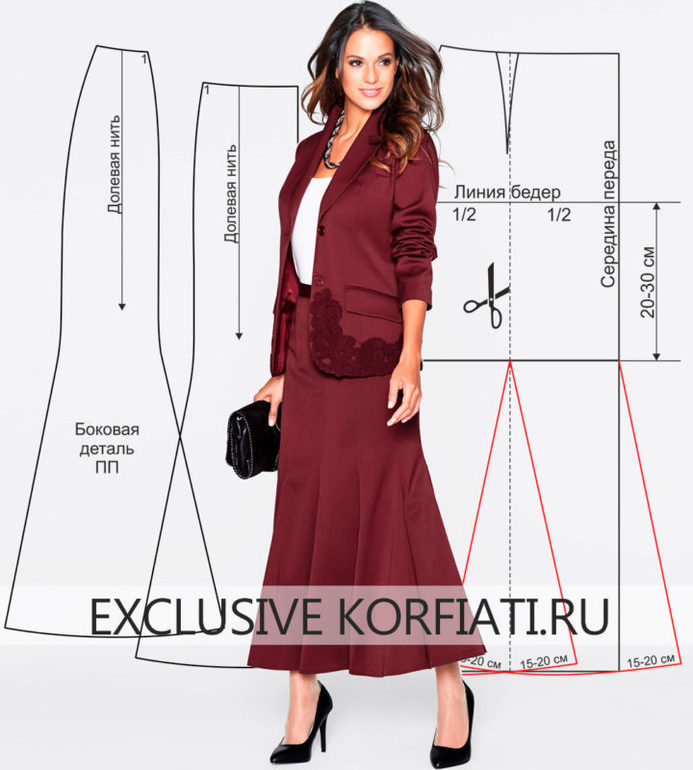 ВАЖНО! Ширину и длину клиньев можно увеличить и подол юбки будет более пышным. Пример такого моделирования мы давали в одном из наших предыдущих уроков Выкройка длинной юбки-годе.