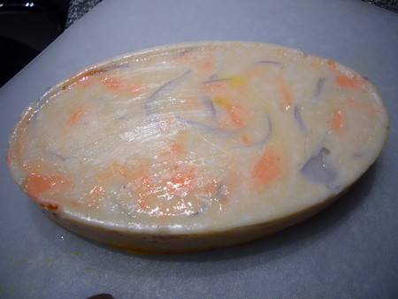 Мыло и косметика своими рукамиБелое с разноцветными кусочками - масло персиковых косточек, детское мыло, молоко, мёд, экстракт зелёного чая.